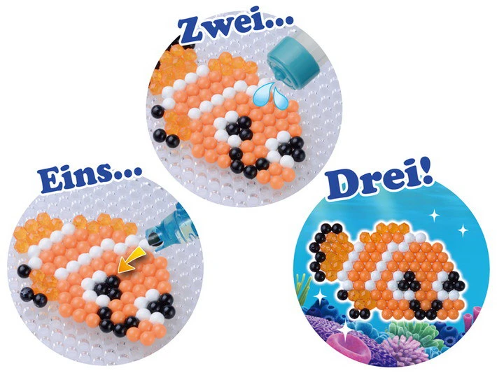 Die Abenteuer von Nemo und seinen Freunde gehen in die zweite Runde und du bist mit Aquabeads dabei! Auf der Suche nach Dories Vergangenheit, kannst du mit diesem Set die Hauptfiguren selbst nachgestalten. Mit über 780 Bastelperlen in 11 Farben, 3 Motiv-Vorlagen, einer Bastelplatte, einem Sprüher, Perlenstift und einer handlichen Perlenbox, steht deiner Kreativität nichts im Wege. Deine Bastelkreationen verbinden sich wie von Zauberhand, ganz ohne Bügeln und nur durch das Besprühen mit Wasser. Was für ein tolles Bastelset – so macht Basteln Spaß!