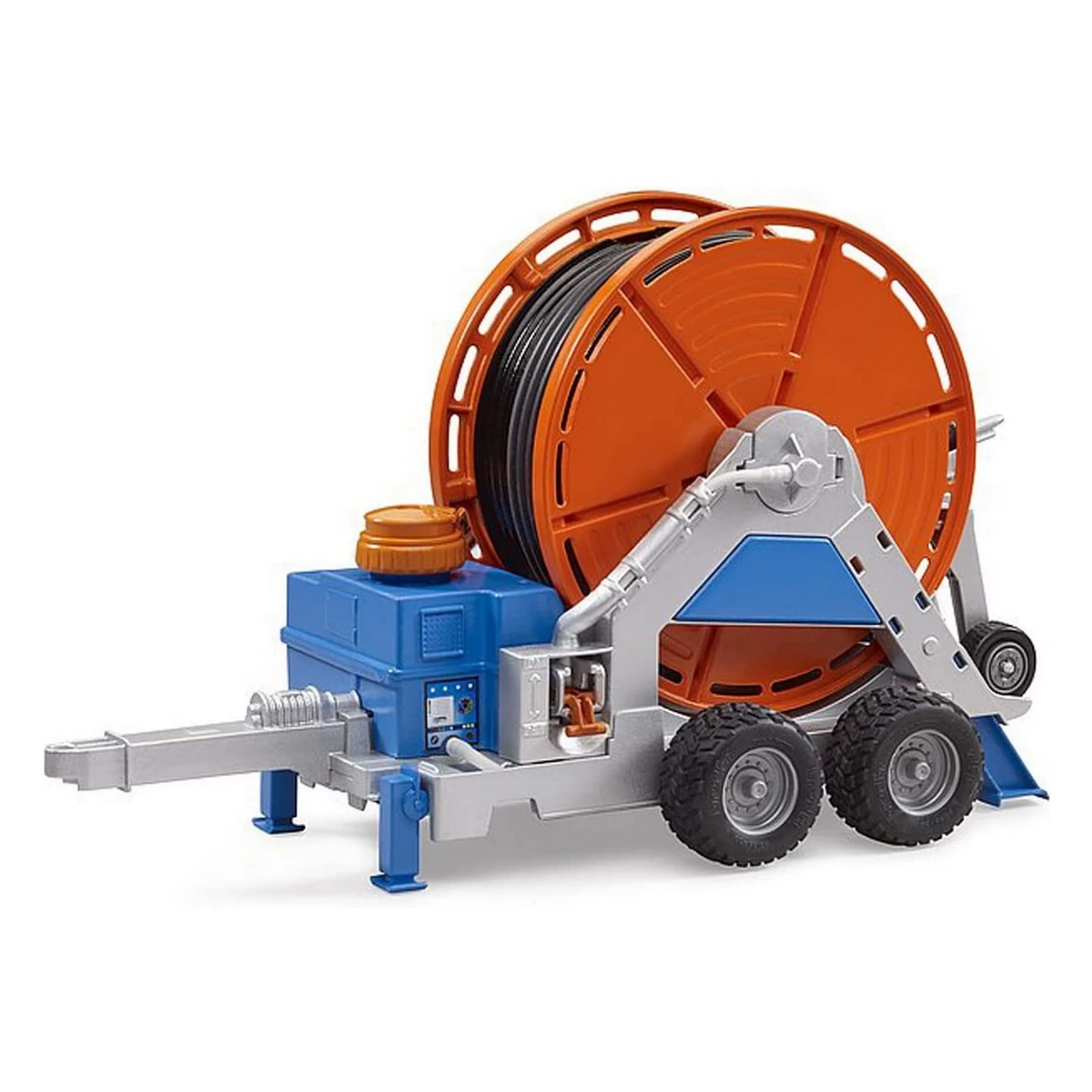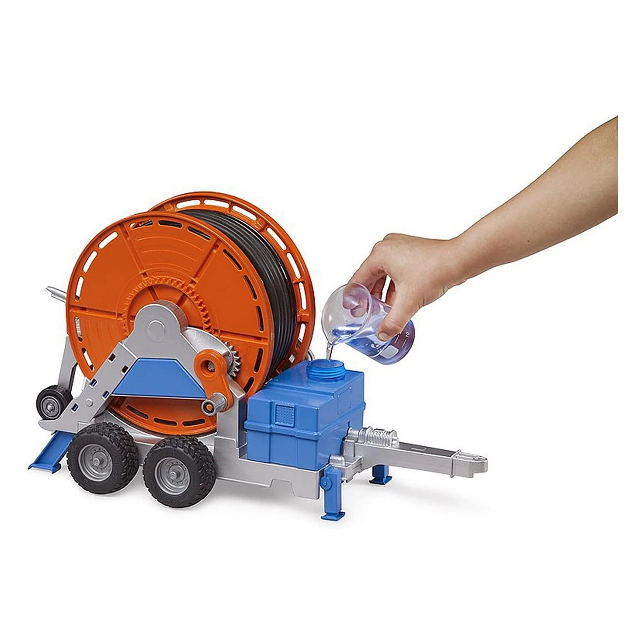 Ob Sportplatz, Baumschule, Obstwiese oder andere große Flächen, überall wo eine gleichmäßige und konstante Wasserversorgung notwendig ist, haben Beregnungsanhänger ihren Einsatzort. Diese wichtige Maschine für eine erfolgreiche Landwirtschaft, gibt es neu im umfangreichen Sortiment von BRUDER. Über die, mit einer Kurbel betriebenen Schlauchrolle, können Nachwuchs-Landwirte einen 1,8 Meter langen Schlauch abrollen, an dem eine detailgetreuer Spritzwagen befestigt ist. Getreu dem BRUDER Motto ‚Just like the real thing‘ ist ein Tank mit funktionierender Pumpe montiert. Mit dem Pumpsystem lässt sich spielend einfach und realitätsnah Wasser verteilen. Dieser spannende Beregnungsanhänger kann von allen BRUDER Traktoren aus der Themenwelt Landwirtschaft gezogen werden.